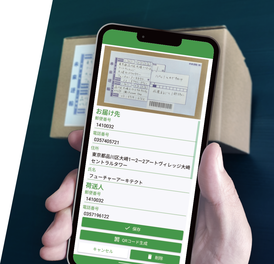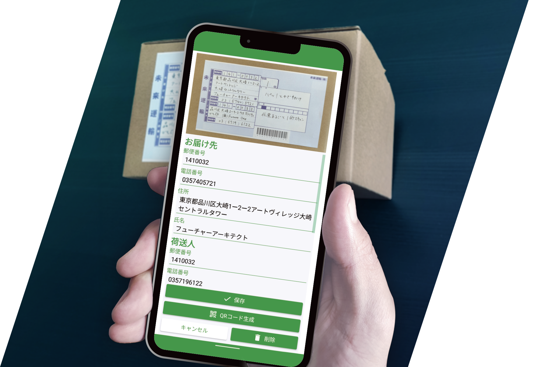 「Future EdgeAI」は、業務用のスマートフォンに取り入れることで、⼿書きの伝票やダンボールに書かれた⽂字、記号を正確に認識し、書類やパッケージに記載された情報をまるごと自動検出・データ化できます。擦れやノイズ、⽔濡れ、折れ、曲がりのある文字にも対応しています。